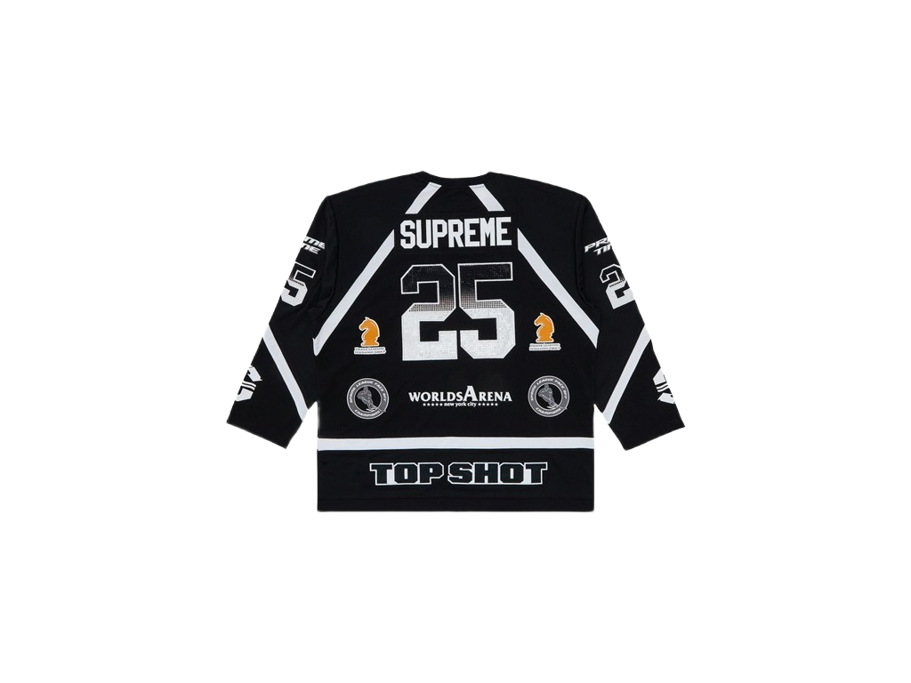 The Supreme Rhinestone Hockey Jersey Black is the perfect piece for streetwear enthusiasts. It brings a luxurious look with a touch of extravagance.